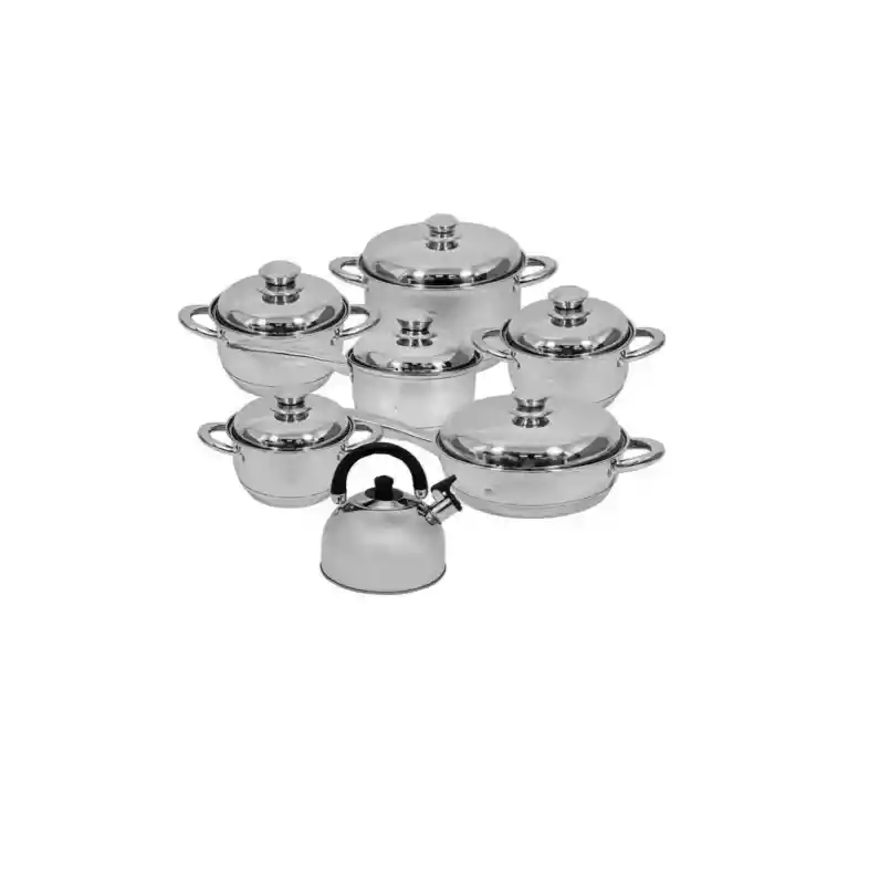 Bateria De Ollas Acero Quirurgico Hoffman Germany 13 Piezas La salud de tu familia es lo más importante y el material en el que preparas los alimentos es esencial, ya que muchas ollas corrientes de aluminio dejan residuos tóxicos en la comida, que aunque son mínimos pueden acumularse en el organismo y con el tiempo convertirse en desencadenantes de enfermedades. Por eso traemos para ti este excelente juego de ollas en acero inoxidable, fabricadas en el tipo de acero que se usa para la instrumentación quirúrgica garantizando que no desprenden ningún tipo de residuo mineral ni aloja microrganismos. Germany es una marca creada en Suiza con el objetivo de ofrecerle a sus clientes concepto y diseño en los productos de cocina, enfocándose en artículos que sean cómodos, fáciles de usar y duraderos, caminando siempre a la vanguardia de la innovación, distinguiéndose por su calidad en el mercado mundial. 100% acero quirúrgico inoxidable, con fondo difusor de aluminio hi-tech. Fino acabado con pulido brillante y tapa de acero inoxidable y control de presión en la misma tapa. Asas y mangos aislantes del calor, con protector para flama de acero inoxidable. Para ser utilizadas en todo tipo de cocinas. Compatible para todo tipo de cocinas. Cuerpo exterior durable CARACTERÍSTICAS PRINCIPALES 100% acero quirúrgico inoxidable Cuerpo exterior durable. COCINE DE MANERA SALUDABLE! MANTENIENDO LA CALIDAD Y LA PRESERVACION DE LOS NUTRIENTES DE LOS ALIMENTOS QUE PREPARAS. LAS OLLAS POSEEN NUEVE CAPAS EN SU BASE, QUE APROVECHAN Y DISTRIBUYEN DE UNA MANERA EFICIENTE LA COCCION. PUEDES COCINAR EN PIRÁMIDE UTILIZANDO VARIAS OLLAS A LA VEZ LO QUE TE PERMITE AHORRAR HASTA UN 40% DE ENERGIA. La bateria cuenta con un termo-difusor de calor que distribuye de manera uniforme el calor a toda la olla así la llama del fogón sea pequeña todas las piezas de las ollas son 100% acero quirurgico tanto las manijas como las tapas, CARACTERÍSTICAS: - Batería en acero quirúrgico - Tapas con escapes de vapor - Termo-Difusor de calor en la base - Apta para cocinar con cualquier estufa (gas, Induccion, halógena) EL JUEGO DE 13 PCS, CON CONTENIDO DE: 1-Olla de 16 cm con capacidad 1.8 litros con tapa 1-Olla de 16 cm con capacidad 1.8 litros con tapa 1-Olla de 18 cm con capacidad de 2.5 litros con tapa 1-Olla de 20 cm con capacidad de 3.4 litros con tapa 1-Olla de 24 cm con capacidad de 6.3 litros con tapa 1-Sartén de 24 cm con capacidad de 3 litros con tapa 1-Tetera