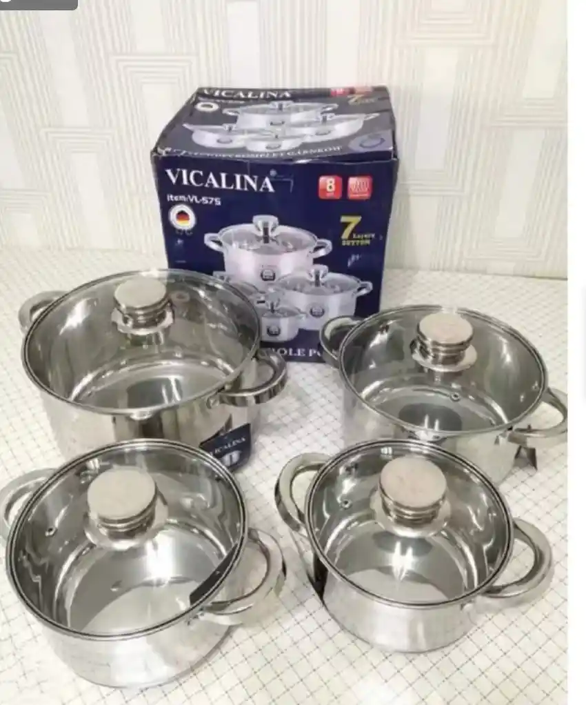 Información adicional La batería cuenta con un termo-difusor de calor que distribuye de manera uniforme el calor a toda la olla así la llama del fogón sea pequeña, todas las piezas de las ollas son 100% acero quirúrgico y tapas de vidrio CARACTERÍSTICAS: - Batería en acero quirúrgico - Tapas con escapes de vapor - Termo-Difusor de calor en la base - Apta para cocinar con cualquier estufa (gas, Inducción, halógena) EL JUEGO DE 8 PCS, CON CONTENIDO DE: 1-Olla de 24 cm con capacidad de 5 litros con tapa 1-Olla de 20cm con capacidad de 3 litros con tapa 1-Olla de 18 cm con capacidad de 2 litros con tapa 1-Olla de 16 cm con capacidad de 1.5 litros con tapa