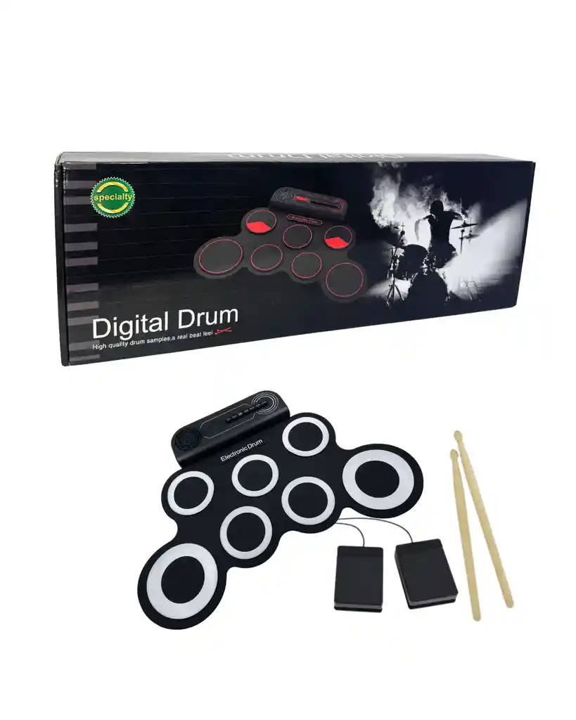 Batería digital electrónica portátil, ideal para practicar y divertirse en casa. Cuenta con pads sensibles al tacto que ofrecen una experiencia realista, sonidos de batería integrados y control de volumen. Incluye pedales, baquetas y es compacta y fácil de transportar, perfecta para principiantes y amantes de la música.
