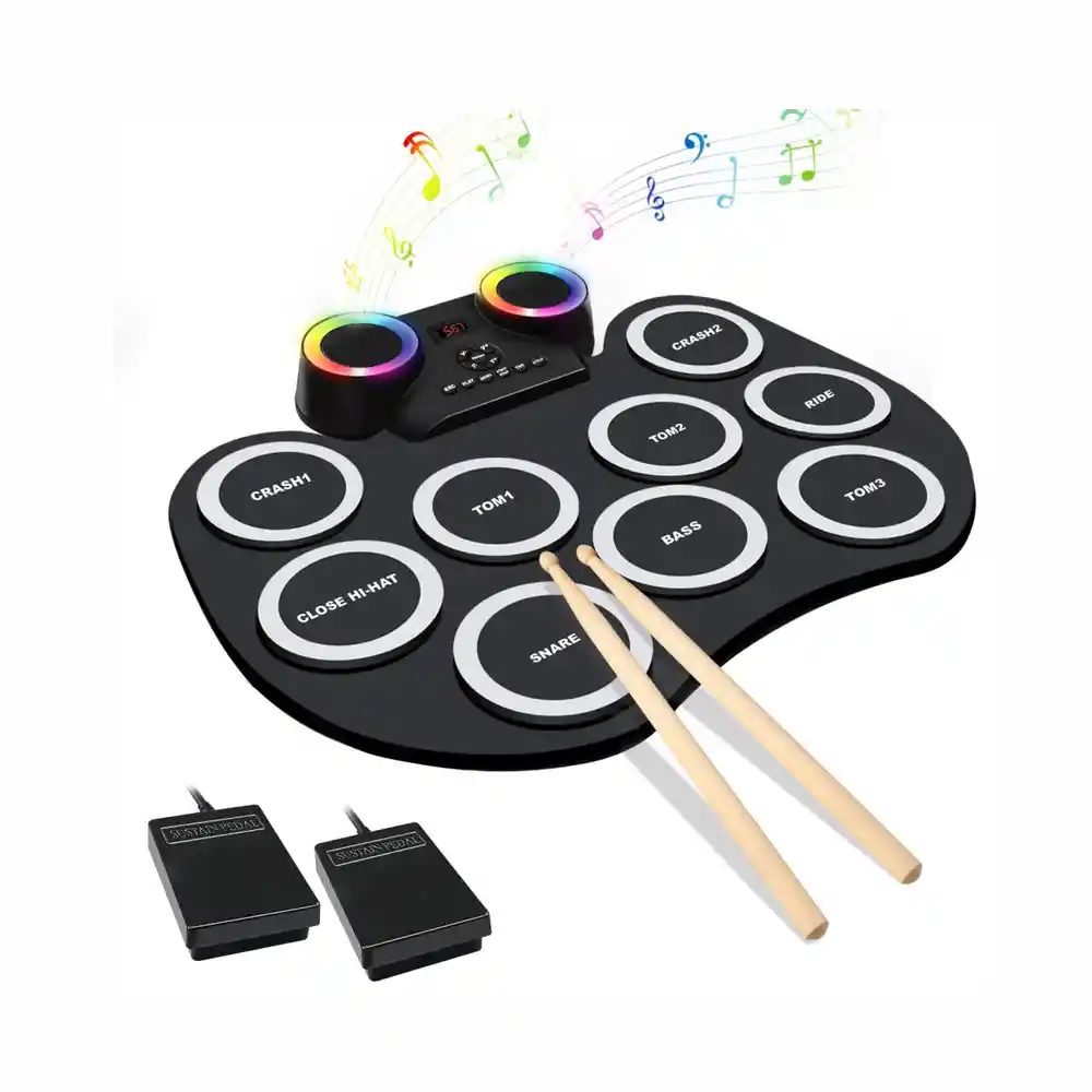 Batería electrónica de 9 tambores actualizado: esta versión actualizada de los tambores contiene la versión de 9 almohadillas sensibles al tacto, incluyendo 3 Toms, 2 HI-Hats, 1 kick Bombo , 1 snare, 1 Ride, 1 Crash, y 2 baquetas, Incluye pedal de Hit-Hat Pedal de bombo Parlantes incluidos Función de altavoz Bluetooth adicional, efectos de luces LED de colores y función REC, puedes reproducir una variedad de estilos de música, como Pop, Rock, Latino, Electrónico, etc. Diseño de altavoz Bluetooth y función de conector de auriculares: nuestros kits de batería tienen altavoces duales integrados, no solo reproducen música para compartir una excelente calidad de sonido y efectos de graves increíbles con otros, sino que también conectan auriculares para practicar el rendimiento silenciosamente tarde en la noche. Mayor uso de vidas y batería de litio recargable incorporada] Nuestro kit de batería de práctica eléctrica funciona con 6 a 8 horas y funciona con una batería de litio recargable de alta capacidad, el tambor se puede cargar con cualquier puerto USB en cualquier lugar. Regalo perfecto para principiantes Nuestra batería digital de mesa de práctica es adecuado para niños/adolescentes/adultos para aprender música y hacer ritmos. Diseño de botón y almohadilla de tambor simple y claro, operación sencilla, sin objetos pequeños, seguro de usar, este kit de batería portátil es el regalo perfecto para cumpleaños, vacaciones, Navidad y toda ocasión. Todos los accesorios incluidos, puedes enchufar y jugar en cualquier lugar Esta batería electrónica Pad portátil se adapta a niños de 2 a 12 años de edad + y principiantes bateristas adultos Dimensiones del producto 45 cm x 35 x 40cm Pilas 1 Polímero de litio necesaria(s), incluida(s) Nombre del color Black Tipo de conector Bluetooth, USB Tipo de batería Polímero de litio Bluetooth Altavoz Incluido Luces led Lo que obtienes con tu compra 1 x Bateria Electrónica de mesa 1 x Par de baquetas 1 x Pedal bombo 1 x Pedal HitHat 1 x Cable Auxiliar 1 x Cable de carga Tipo C 30 Días de garantía por defectos de fabricación. -Recuerda que la vida útil de tu PRODUCTO depende directamente de su uso. Por esto mismo te recomendamos seguir todas las instrucciones que trae cada artículo al pie de la letra y leer el manual de GARANTÍA.