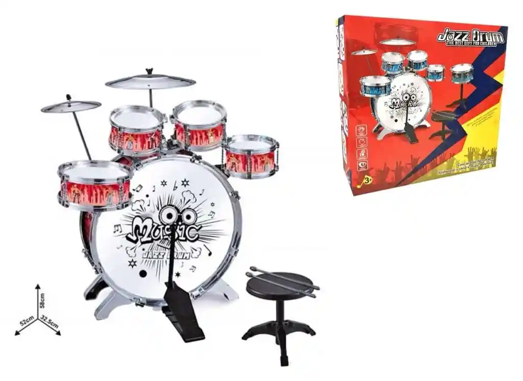 Despierta el talento musical de los más pequeños con esta increíble batería infantil! El set Jazz Drum "Magic" está diseñado especialmente para niños a partir de 3 años, ofreciendo una experiencia divertida, educativa y llena de ritmo. Características: Set completo con varios tambores, platillos, pedal, asiento y baquetas. Diseño seguro y resistente para uso infantil. Estampado colorido y llamativo que estimula la creatividad. Desarrolla habilidades como la coordinación motriz, el ritmo y la expresión musical. Promueve el juego en solitario o en grupo, fomentando la confianza y el sentido del ritmo. Ideal para regalos de cumpleaños, Navidad o cualquier ocasión especial.Desarrolla habilidades como la coordinación motriz, el ritmo y la expresión musical. Promueve el juego en solitario o en grupo, fomentando la confianza y el sentido del ritmo. Ideal para regalos de cumpleaños, Navidad o cualquier ocasión especial. ¡Haz que tu hijo se sienta como una verdadera estrella del rock desde casa! El set contiene 6 tambores 1 pedal 2 platillos 2 Baquetas 1 Silla Dimensiones aproximadas 60X65 cm (ARMADO