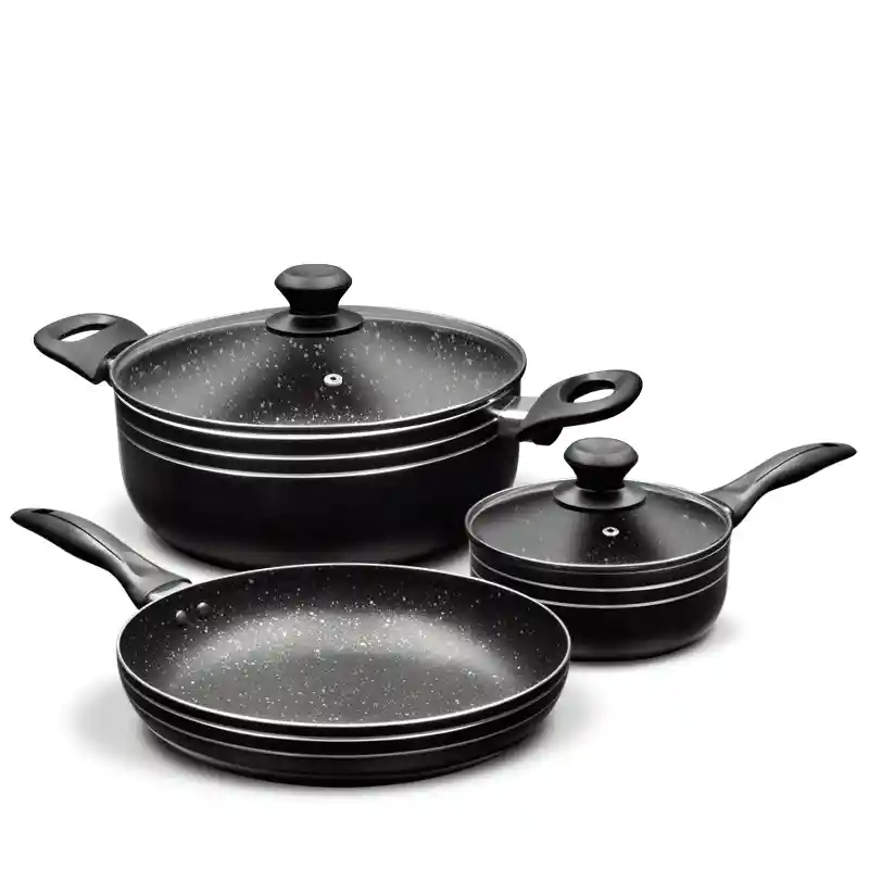 Batería 5 Piezas antiadherente, material de aluminio tipo piedra, su tapa de vidrio cuenta con un regulador de vapor para evitar posibles derrames. Piezas incluidas: sartén 24cm, olla con tapa 24cm, perol con tapa 16cm.