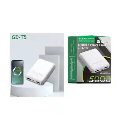 "Bienvenidos a GENUINOS SHOP Tecnología del futuro" ¡Somos expertos en los mejores artículos de tecnología, belleza y hogar con amplia trayectoria y calidad garantizada! Entregas inmediatas en la ciudad de Bogotá y envíos a Nivel Nacional. Capacidad de 5000mAh para múltiples cargas de dispositivos Conector MicroUSB compatible con gran variedad de equipos Incluye cable para mayor comodidad al cargar Cargador portátil, ideal para llevar en bolsos o mochilas Marca Power Bank y modelo GD-T5, garantía de calidad IMPORTANTE Para poder tener una buena experiencia en tu compra, te recomendamos que leas detalladamente las siguientes recomendaciones: • Lee completamente la descripción del producto. • Revisa muy bien los términos y condiciones de garantía. • Revisa muy bien que sea el producto que necesitas para evitar devoluciones. Garantía del vendedor: 30 días