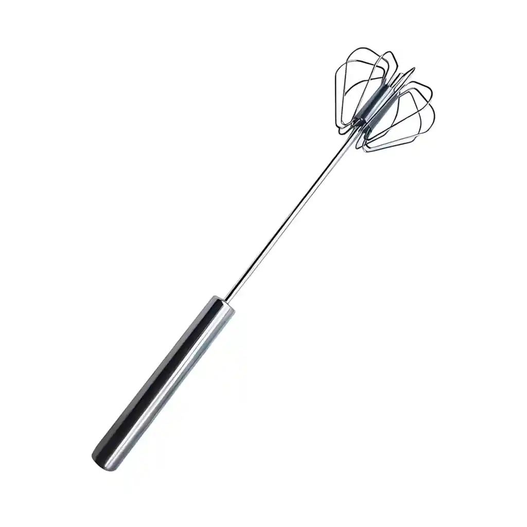 Batidor manual de acero inoxidable, diseñado para mezclar de forma rápida y eficiente distintos ingredientes sin esfuerzo. Su cabezal giratorio automático se activa con un simple movimiento vertical, generando aire en las preparaciones y logrando mezclas suaves y homogéneas. Gracias a su estructura resistente y su mango ergonómico, es ideal para batir huevos, salsas, cremas, aderezos, chocolate caliente, café y mucho más. Ligero, duradero y fácil de limpiar, es una herramienta indispensable en cualquier cocina por su practicidad y excelente desempeño.