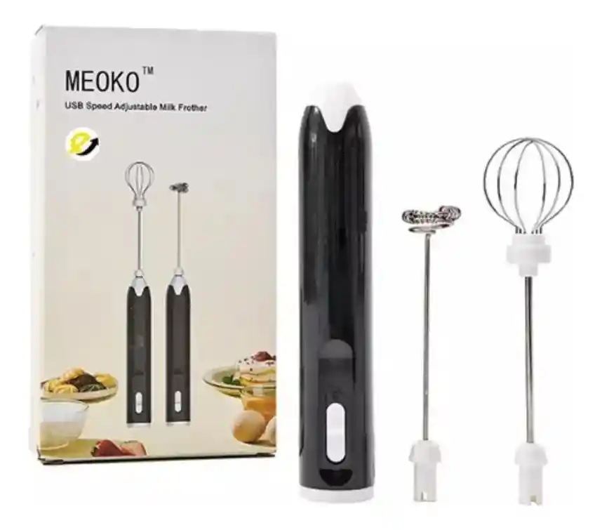 Tipo: Batidor de mano recargable USB con cabezales intercambiables. Funciones: Ideal para hacer espuma de leche para café en menos de 20 segundos, mezclar bebidas y batir huevos. Contenido: Incluye la unidad principal, un accesorio de batidor y un accesorio para mezclar. Especificaciones: Fabricado en plástico y metal, con un peso aproximado de 111 gramos.