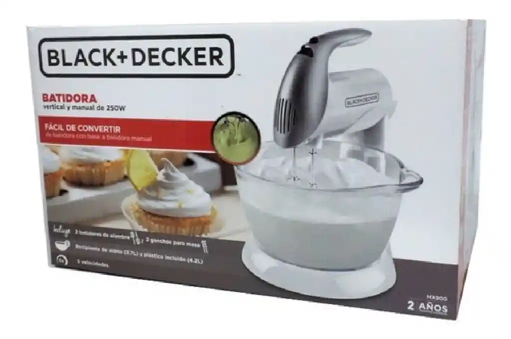 Especificaciones Disfrute de la potencia para mezclar con facilidad. Esta prctica batidora cuenta con 5 velocidades. El potente motor de 250 watts brinda una variedad de funciones de mezclado. El conveniente taln y descanso para recipiente facilitan colocar la batidora en posicin de descanso entre las tareas. 250 watts 5 velocidades Botn de expulsin Soporte en pedestal Mango ergonmico Recipiente de vidrio Recipiente de plstico 2 Batidores de alambre 2 Ganchos para masa Garanta 2 Aos Color Blanco y Gris.