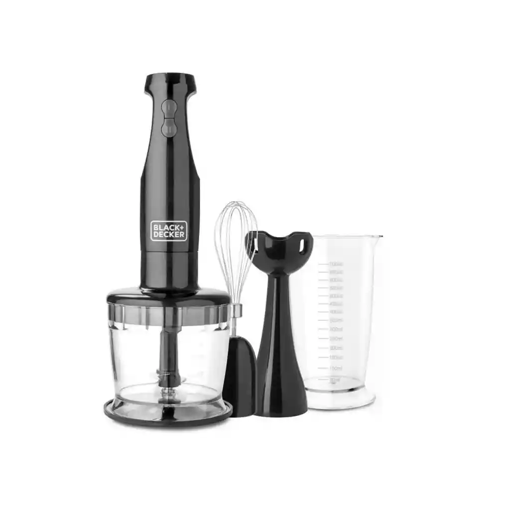 Batidora de inmersión 3-en-1 de BLACK+DECKER es lo último en herramientas universales de cocina. Reemplaza sus electrodomésticos diferentes con esta herramienta que fácilmente le ayuda con sus comidas favoritas. Los accesorios incluyen: Taza de mezclar, recipiente para picar, batidor de huevos. El mini picador es perfecto para picar nueces, vegetales y más. Especificaciones: 200 watts 2 Velocidades Controles de un toque Taza de medir/mezclar con boquilla fácil de verter (700ml) Cuchillas de acero inoxidable Batidor de huevos de acero inoxidable Cuchillas de acero inoxidable para cortar Cuchillas de acero inoxidable para licuar Recipiente para picar (500ml) con cuchillas de acero inoxidable Manuales de uso y Cuidado