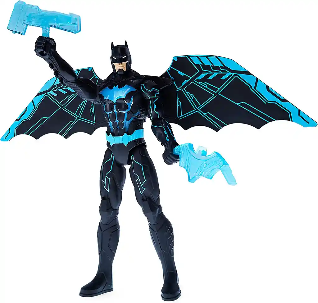 Batman Bat-Tech Alas Expandibles Luces y Sonidos 30cm + ¡Lleva tus misiones de Batman al siguiente nivel con la lujosa figura de acción Bat-Tech Batman de 12 pulgadas! + Esta figura de Batman está repleta de características épicas por descubrir: grandes alas de murciélago que se expanden, accesorios que se iluminan y más de 20 emocionantes sonidos y frases. + Coloca el blaster y el Batarang en cada una de las manos de la figura y prepárate para defenderte de los supervillanos de Gotham City. + Tira de la palanca en la parte posterior de la figura hacia abajo para hacer que las alas de Bat-Tech Batman se transformen y se abran, ¡luego sube al cielo! + Para activar las luces y los sonidos, presione el símbolo del murciélago en el pecho de su figura y observe cómo se iluminan el símbolo, partes del traje de baño y el arma en la mano derecha. + Cierra las alas empujando la palanca hacia arriba y continúa tus misiones en las calles de Gotham City. + Con una escultura muy detallada con estilo azul Bat-Tech y siete puntos de articulación, posa tu figura de Batman mientras usas tu imaginación para desarrollar tus misiones..
