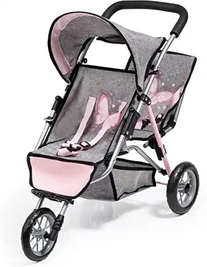Carrito Doble Para Muñecas, Comruedas Delanteras Giratorias, Color Gris, Rosa