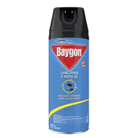 Actúa sobre el mosquito que puede provocar el dengue. Insecticida Baygon mata zancudos, moscas y otros insectos voladores, como polillas y moscos que pueden transmitir zika, dengue y chikungunya protegiendo a tu familia de sus picaduras. Recuerda agitar bien el producto antes de usarlo. Cuida tus espacios de insectos. Tiene una acción efectiva para estar siempre libre de picaduras.