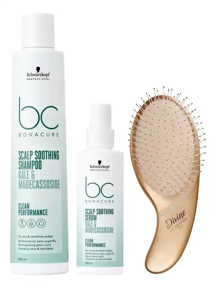 Kit Bonacure Scalp Care Calmante para Cuero Cabelludo Sensible ¿Qué incluye este kit? Shampoo Calmante 250 ml Sérum Calmante 100 ml + Shampoo Calmante 250 ml Beneficios: + Obsequio Peine OLIVIA GARDEN Limpia suavemente el cabello y el cuero cabelludo. Calma el cuero cabelludo y refuerza la estructura capilar. Ayuda a equilibrar el nivel de hidratación del cuero cabelludo. Nutre el cabello, dejándolo suave y flexible. Reequilibra el cuero cabelludo y asegura la calidad futura del cabello. Dermatológicamente aprobado para su uso en el cuero cabelludo. Apto para uso diario. Cómo Funciona: La fórmula vegana y libre de sulfatos con Superfood Complex está enriquecida con col rizada y madecassoside. Limpia suavemente el cabello y el cuero cabelludo al tiempo que aporta hidratación adicional para un cuidado ligero. El cuero cabelludo se reequilibra y se asegura el estado futuro del cabello. Modo de Uso: Aplicar sobre el cabello húmedo, deja actuar durante 2 minutos y enjuaga bien. Para mayores resultados, usar después de la ducha el sérum Bonacure Scalp Care Calmante. + Sérum Calmante 100 ml Beneficios: Calma, relaja y reequilibra instantáneamente el cuero cabelludo. Alivia y ayuda a proteger el cuero cabelludo de la sequedad, el picor y la sensibilidad. Fórmula ligera, no grasa y de rápida absorción. Reequilibra el cuero cabelludo y asegura la calidad futura del cabello. Dermatológicamente aprobado para su uso en el cuero cabelludo. Apto para uso diario. Cómo Funciona: La fórmula vegana, libre de sulfatos, de rápida absorción con Superfood Complex está enriquecida con col rizada y madecassoside. Calma el cuero cabelludo gracias a sus propiedades antiinflamatorias, dejando el cuero cabelludo hidratado tras una sola aplicación. El cuero cabelludo se reequilibra y el estado futuro del cabello queda asegurado. Modo de Uso: Aplicar sobre cabello húmedo, sobre el cuero cabelludo por secciones y masajear con suavidad. No enjuagar. Para mayores resultados, usar en conjunto con el shampoo Bonacure Scalp Care Calmante. Componentes: COL RIZADA: Contiene Vitaminas A, B, C, K, antioxidantes, Omega-3 y Omega-6. Los Antioxidantes ayudan a reducir la inflamación. Los ácidos grasos pueden ayudar a nutrir el cuero cabelludo. MADECASSOSIDE: Activo puro procedente de las hojas de Centella asiática. Contiene propiedades calmantes y antiinflamatorias que ayudan a calmar la piel. Sus propiedades hidratantes mejoran la retención de humedad de la piel. Nuevo Bonacure Scalp Care EL CUERO CABELLUDO ES DONDE EL CUIDADO COMIENZA… Los nuevos productos Bonacure para el cuidado del cuero cabelludo, veganos y libres de sulfatos, presentan potentes fórmulas con Superfood Complex, enriquecidas con superalimentos y activos para el cuidado de la piel. Los productos garantizan un cuero cabelludo reequilibrado para mejorar la calidad y el estado del cabello en el futuro. Creados por expertos en cabello y cuero cabelludo, todos los productos de la gama Bonacure para el cuidado del cuero cabelludo han sido sometidos a una evaluación dermatológica para aprobar su idoneidad para las diversas necesidades del cuero cabelludo. El camino hacia un cabello perfecto requiere de un cuidado especial, y hoy puedes lograr ese cambio de la mano de Schwarzkopf. *Obsequio Olivia Garden* Este exclusivo peine de Olivia Garden es el complemento perfecto para tu rutina de cuidado capilar. Con cerdas flexibles que se adaptan a cualquier tipo de cabello, este peine es capaz de desenredar el cabello sin esfuerzo, incluso cuando está mojado. Su diseño ligero y ergonómico lo hace fácil de llevar a cualquier lugar, asegurando comodidad y funcionalidad en todo momento. Además, previene el quiebre y el daño del cabello, garantizando un cuidado suave y efectivo. Somos La Tienda Oficial de Schwarzkopf Profesional, compra tranquilo y seguro.