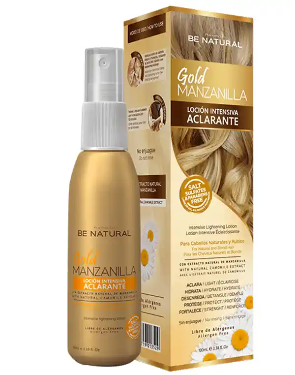¡Logra cabello más y más sin maltratarlo! La Loción Aclarante Be Natural Gold Manzanilla ayuda a aclarar progresivamente tu cabello, sin necesidad de someterlo a procesos químicos. Este spray para aclarar el cabello y vellos esta enriquecido con manzanilla, su fórmula es libre de sulfatos y parabenos. Además, este aclarador de cabello te permite lograr un look natural sin secar la fibra capilar. Beneficios principales: o Apariencia natural. o Ayuda a aclarar el cabello. o Libre de sulfatos y parabenos.