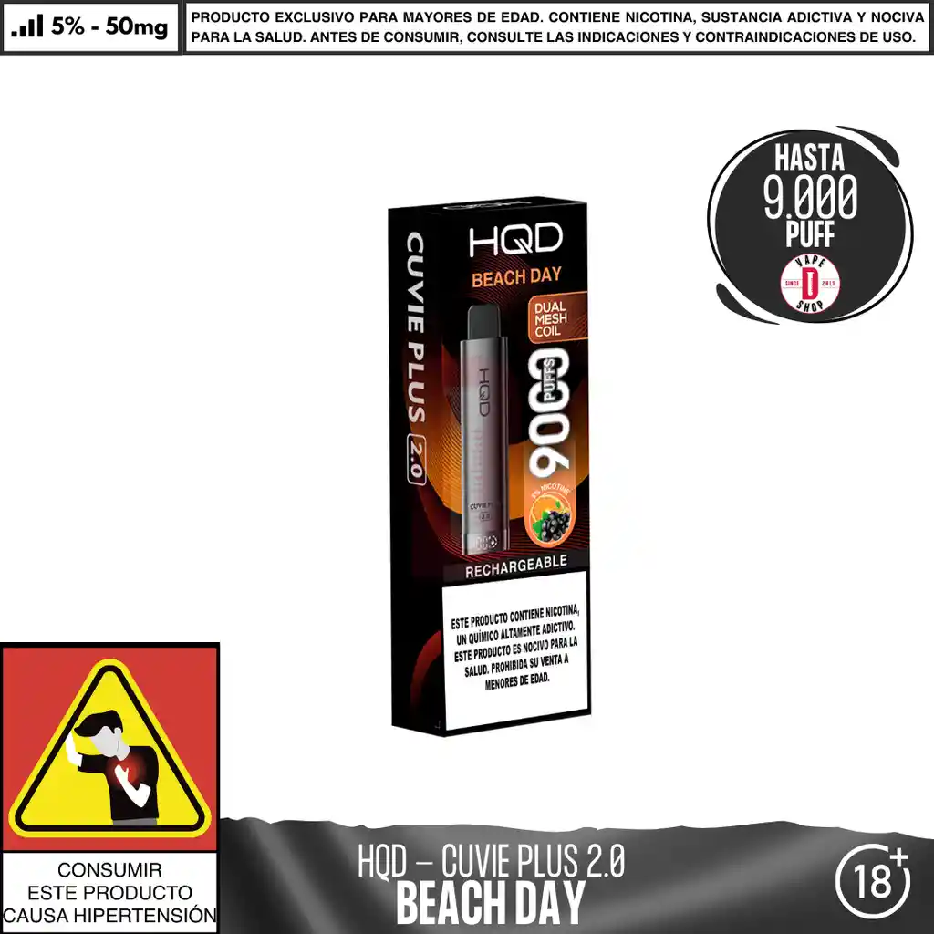 HQD - Cuvie Plus 2.0 9000 PUFF Contenido del paquete: 1 dispositivo desechable Características del dispositivo: Dispositivo de vapeo desechable Material: Aluminio 18 ml de capacidad 1 dispositivo por paquete Batería: 600 mAh (Recargable) 9000 caladas aproximadamente Ingredientes: Glicerina Vegetal, Propilenglicol, Aromatizantes Naturales y Artificiales, Ácido Benzoico, Nicotina. Advertencia: Contiene nicotina, que puede ser venenoso. Evitar el contacto con la piel y los ojos. No ingerir. Mantener siempre en empaque original y en un ambiente fresco y seco. Mantener alejado de niños y mascotas. No debe utilizarse por Mujeres en estado de embarazo o personas con problemas de respiración como el asma. En caso de accidente contacte a la línea 123. Prohibida la venta a menores de edad. Producto nocivo para la salud que contiene nicotina, sustancia altamente adictiva. Antes de consumir consulte las indicaciones y contraindicaciones de uso