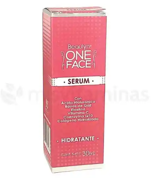 Serum One Face con acido hialuronico, bayas de goji, elastina, vitamina c, coenzyma q10, colageno hidrolizado. Hidratara tu piel aplicando de 2 a 4 gotas en la zona del pomulo y extiende con las yemas de los dedos, haciendo movimientos circulares y de alisado desde interior hacia el exterior.
