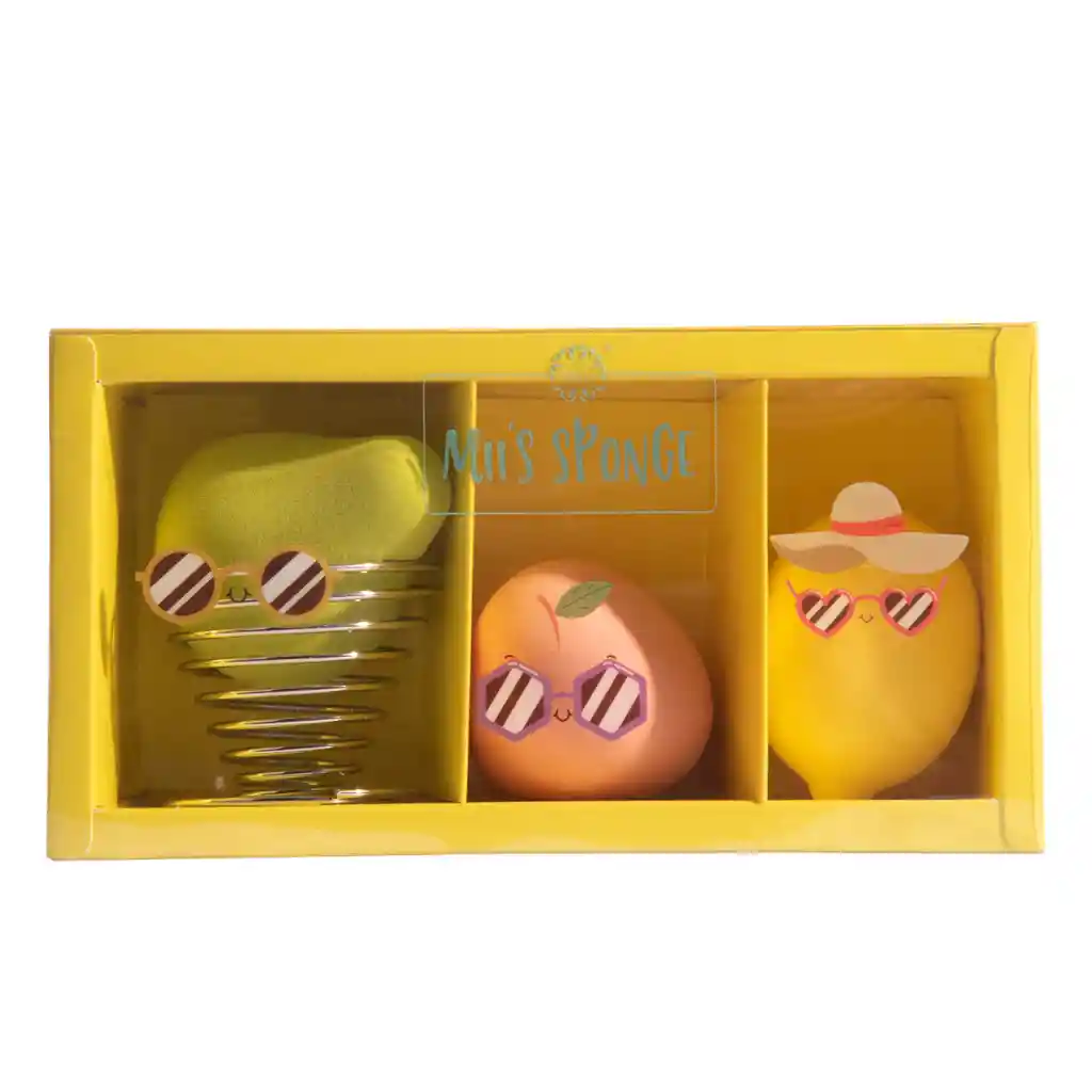 Beauty blenders x3, vienen en su bello diseño tropical que le da a cada una de ellas una forma diferente, tipo pera, limón y melocotón, ideales para llegar a todas las áreas del rostro y además incluye un soporte dorado en espiral para tu beauty blender favorita.
