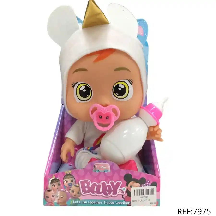 Muñeca bebé con tetero y chupón, vestida de unicornio. Ideal para juegos de cuidado. Recomendado desde los 3 años.