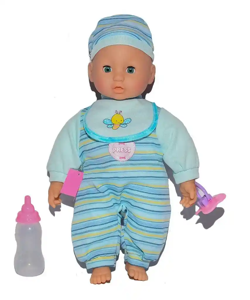 Bebe muñeco - Funciones: Presionas el pecho o las manos y habla mas de 7 frases con luces en los cachetes. - Frases que dice: "papá papá vamos a jugar! - mamá que sueñito - mamá me encanta tu sonrisa - cantame una música - mamá me encanta tu compañía - somos inseparables - eres parte de mi vida - tu y yo siempre juntos - mamá estoy tan feliz - mamá me das un beso - mamá abrázame - mamá te quiero mucho - mamá tengo hambre quiero merendar - te amo mamá - mamá tengo sueñito quiero dormir - mamá me llevas a pasear". - Funciona con tres pilas para reloj de 1.5 v. - Tamaño: alto 34 cm - ancho 20 cm