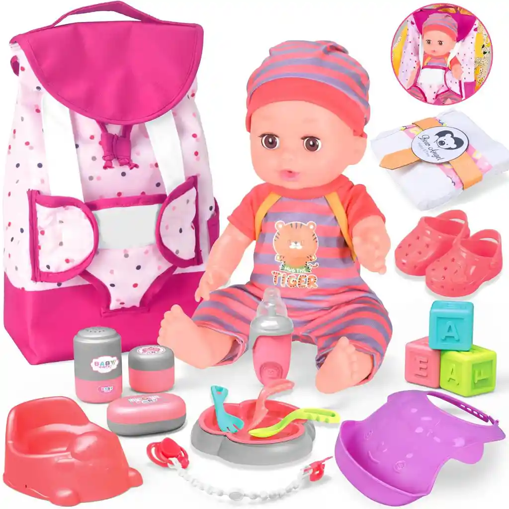 bebe mediana con maleta para cargar viene con tetero de juguete y mas accesorios