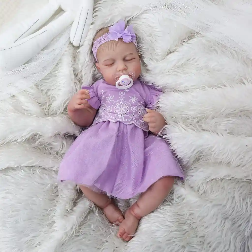 Bebé Reborn Sammy: Con su adorable ropa morada, este bebé reborn destaca por su ternura y detalles realistas, perfecto para quienes buscan un compañero especial.
