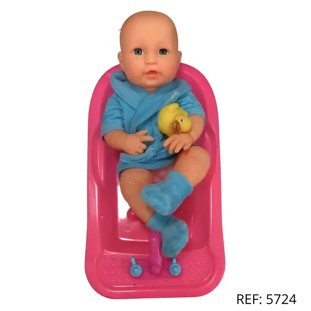 Muñeco con tina, bata azul y patito. Perfecto para hora de baño imaginativa.