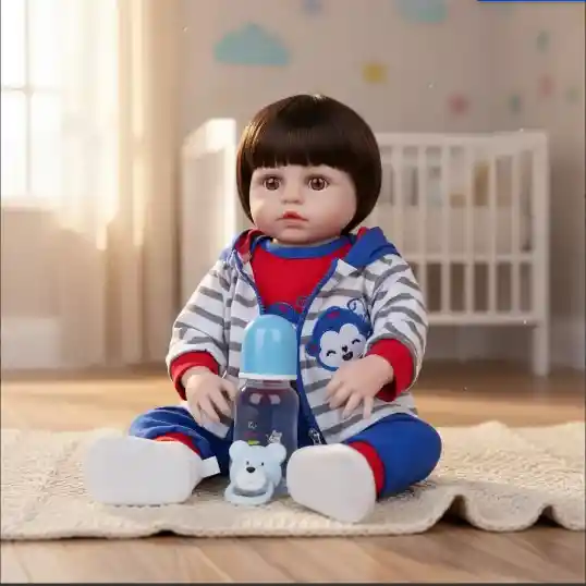 ¡Un bebé reborn que parece de verdad! Dale a tu pequeño un compañero especial con este hermoso bebé realista, hecho de silicona de alta calidad, con detalles cuidadosamente diseñados para una apariencia auténtica. ¡Perfecto para jugar, abrazar y estimular la imaginación! Características destacadas: - Material premium: Extremidades y torso de silicona para una textura suave y realista. - Medidas ideales: 45 cm de altura y peso balanceado para una sensación auténtica. - Articulado: Brazos y piernas móviles para mayor realismo y diversión. - Cabello sintético: Hermoso y suave, fácil de peinar. - Diseño adorable: Con un encantador atuendo de marinero que derretirá corazones. Incluye accesorios: Tetero de 4 oz Pañal Zapatos Beneficios: - Estimula el juego de roles y la imaginación. - Ideal para niños mayores de 2 años. - Sensación y apariencia similar a un bebé real. ¡Regala momentos inolvidables con este bebé de silicona 100% realista!