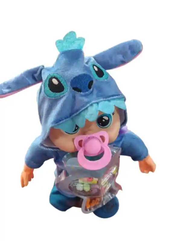 BEBE STITCH LLORONEste adorable muñeco bebé viene vestido con un disfraz tipo animalito azul, suave al tacto y con detalles bordados en la capucha, como orejitas y ojos tiernos. Incluye un chupo (tetero/pacificador) de juguete y un envase transparente con accesorios o dulces decorativos, lo que lo hace ideal para regalo, colección o juego imaginativo. El muñeco está diseñado con materiales ligeros y resistentes, lo que facilita su manipulación por niños pequeños. Su traje acolchado y colorido lo hace atractivo y llamativo. ⚙️ FUNCIONAMIENTO DEL PRODUCTO El muñeco es articulado en brazos y piernas, permitiendo acomodarlo sentado o de pie (según modelo). El chupo puede colocarse y retirarse fácilmente de la boca del muñeco, haciendo el juego más realista. El disfraz es removible dependiendo del diseño, permitiendo vestir y desvestir al muñeco. Los accesorios incluidos pueden utilizarse para decorar o para complementar el juego de cuidado del bebé. Este juguete no posee mecanismos electrónicos; su funcionamiento es completamente manual mediante la interacción del niño. 🛠️ CUIDADOS DEL PRODUCTO 🔹 1. Limpieza Limpia el muñeco con un paño suave ligeramente húmedo. El disfraz puede lavarse a mano con agua fría y jabón suave. Evita mojar partes internas del muñeco para no deformarlo. 🔹 2. Almacenamiento Mantén el juguete en un lugar seco y ventilado. Evita el contacto prolongado con el sol para que los colores no se decoloren. Guarda los accesorios pequeños para evitar pérdidas. 🔹 3. Conservación del material No jalar con fuerza las extremidades o el traje. Evita que el muñeco caiga desde alturas para no aflojar articulaciones. Si el accesorio transparente contiene dulces decorativos, manténlo alejado de humedad para evitar daños. 🔹 4. Seguridad Apto para niños dentro de la edad recomendada. Supervisar si hay niños muy pequeños, debido a accesorios pequeños que podrían tragarse.MEDIDAS DEL PRODUCTO peso 316 Ancho 18 cm 35.2 cm Alto 13.2 LargoPRODUCTO IMPORTADO