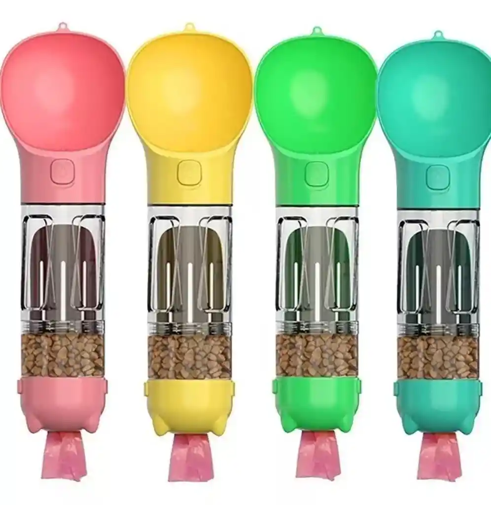 Bebedero 4 en 1 sirve para llevar agua, comida, bolsas y tiene pala para recoger popo.