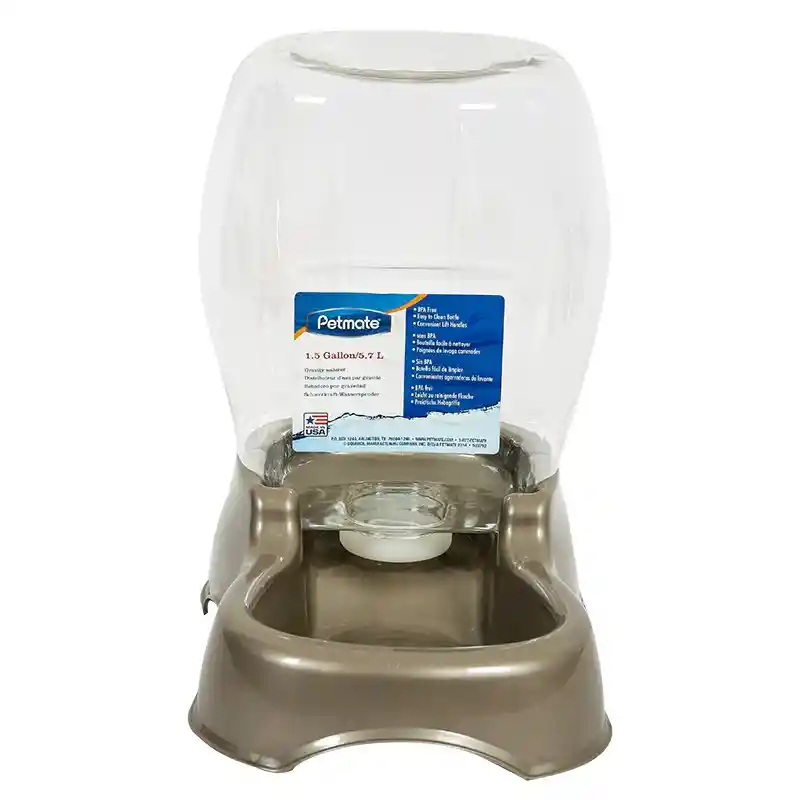 Bebedero de mascotas. Elaborado de plástico. Parte superior transparente en forma de botellón. El botellón es atraíble. Posee una tapa de color blanca que regula la cantidad de agua a suministrar. Fácil de limpiar. Capacidad de 1.5 galones Bebedero por gravedad.