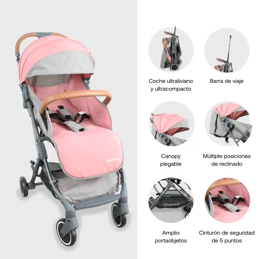 -Ultra Compacto - Sistema de Plegado a Una Mano - Canopy Extensible - Espaldar Reclinable - Ultra Liviano - Incluye Barra de Transporte - Ideal Para Viajar - Freno Centralizado - Canasta Porta Objetos - Telas Melange - Barra Frontal de Seguridad - Terminados Tipo Cuero.