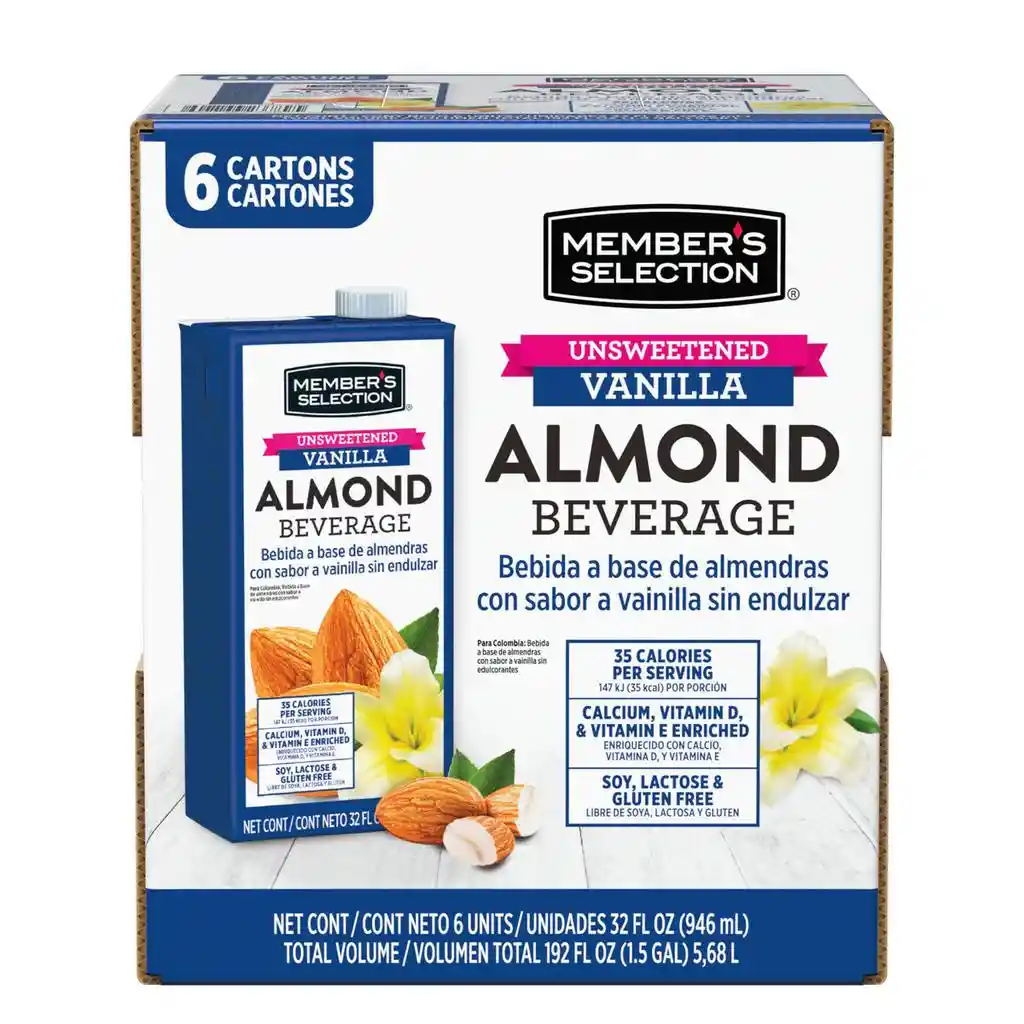 Contiene 35 calorías por porción | Listo para consumir | Almacenar en un lugar fresco y seco. Después de abierto, mantenerlo refrigerado y consumirlo antes de 7 días. Deléitate con la pureza de Member's Selection Bebida de Almendra Sin Endulzante en este paquete de 6 unidades de 946 mL cada una.