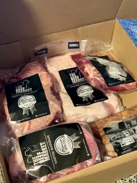 Caja: Incluye 1 Tomahawk. 1 T-Bone. 1 Rib Eye. 1 New York Steak. 1 Medallon de Solomito de Res. 1 Chorizo.