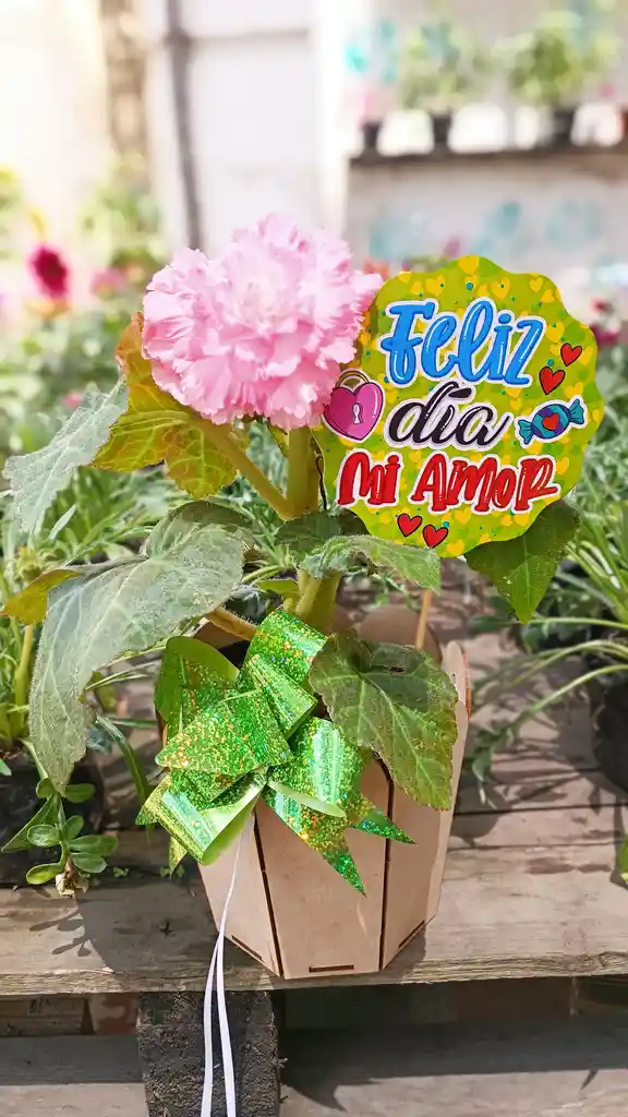Detalle de amor y amistad : Caja de plantas con logo de para ti , acompáñado de un hermosa planta llamada begonia de flor grande con flores muy diversas .