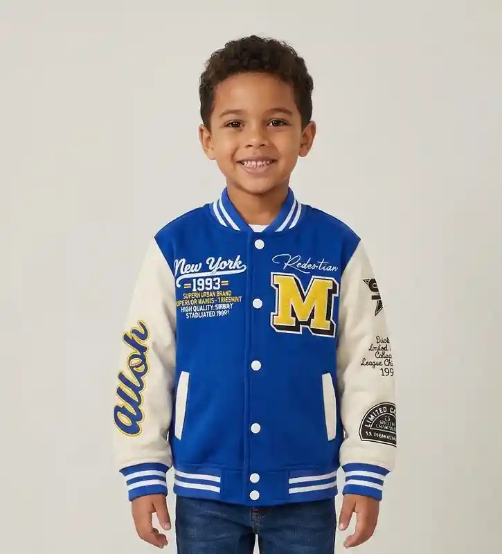 Diseño y Estilo: Esta prenda captura la esencia del estilo universitario americano en una versión infantil moderna. Presenta un cuerpo en color azul real que contrasta dinámicamente con las mangas en tono crema/marfil. Detalles Clave: Parches y Bordados: Luce un parche de gran tamaño con la letra "M" en el pecho, con relieve en amarillo y bordes negros. Incluye gráficos tipográficos de estilo retro como "New York 1993" y tipografía cursiva en las mangas que le otorgan un aire auténtico. Cuello y Puños: El cuello, los puños de las mangas y el dobladillo inferior son de tejido elástico acanalado, decorados con las icónicas rayas blancas horizontales.