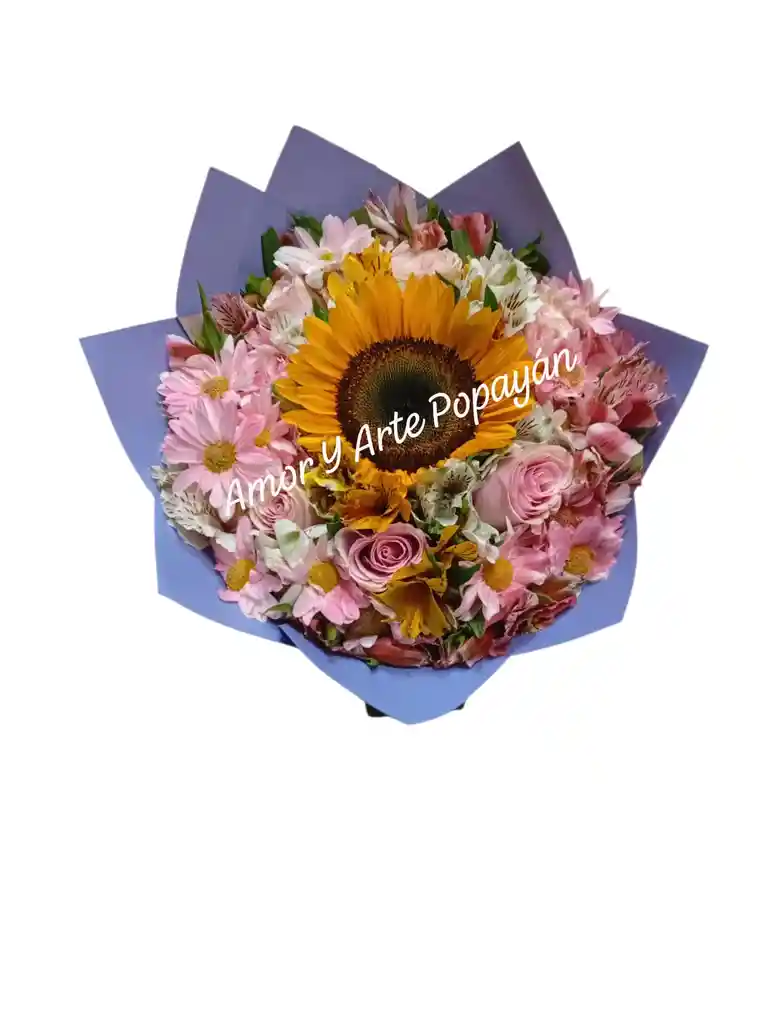 Bouquet de girasol, bañado en rosas, astromelia y margaqrita. Incluye: moño, tarjeta con mensaje personalizado, aroma y brillo