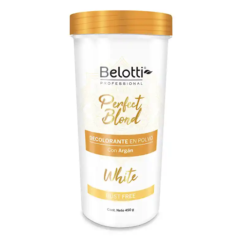 BELOTTI PERFECT BLOND DECOLORANTE EN POLVO WHITE CON ARGAN 450 G Te brinda resultados de alta calidad en decoloraciones totales o parciales que obtendrás rápidamente. Brinda resultados precisos mediante aclaraciones controladas. logrando rubios radiantes y cabello sano. incluso al decolorar cabello oscuro.