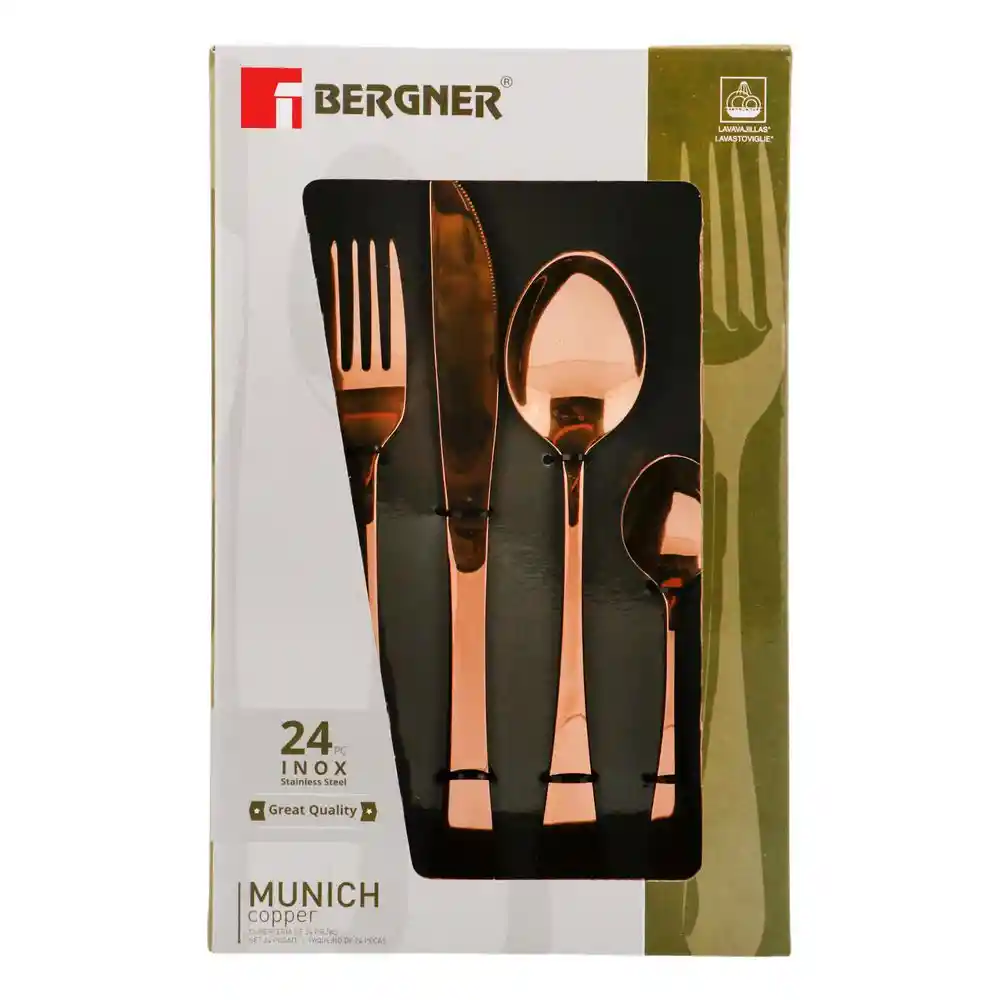 Set Bergner Contiene 24 Unidades. Cuchillo 6 Und + Tenedor 6 Und + Cuchara Cafetera 6 Und + Cuchara Sopera 6 Und.