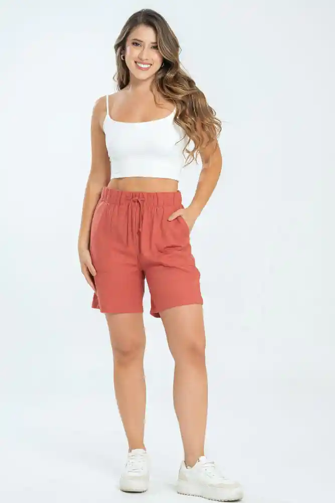 En Tejido Plano Tipo Lino Pretina Con Elástico de 5 cms Talle Alto Bolsillos de Parche en la Parte Delantera Con Boca en Diagonal Largo Arriba de la Rodilla Ruedo de 2 cms Silueta Semi- Ajustada.