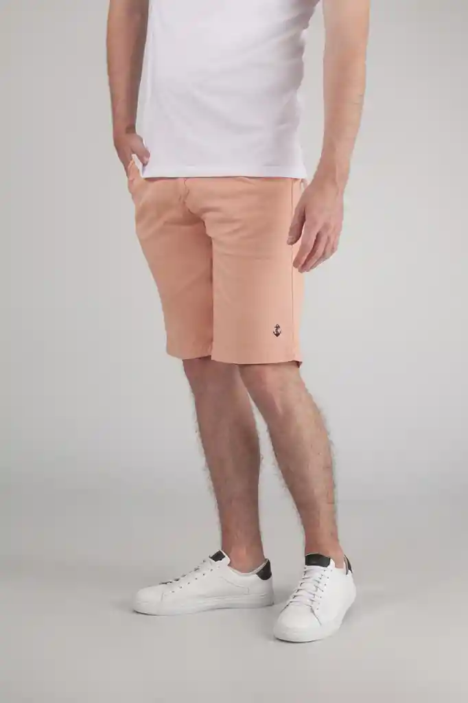 BERMUDA EN DRILL COLOR SALMÓN CON LOGOTIPO BORDADO COLOR AZUL NAVY.