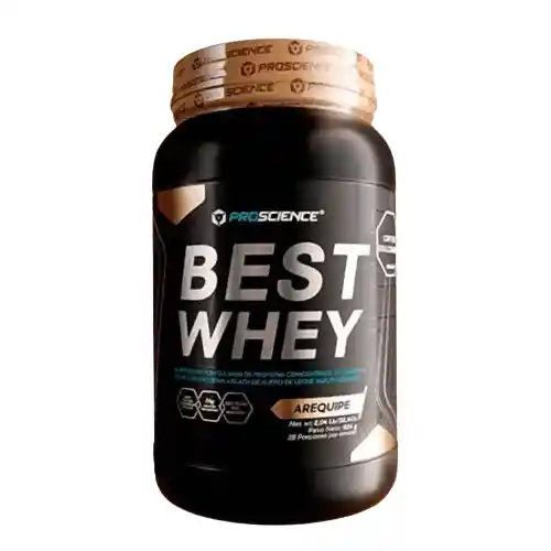 Best Whey es la proteína base de Proscience. Al igual que las demás whey del mercado, Prsocience mezcla proteína CONCENTRADA Y AISLADA de suero de leche para obtener una excelente proteína PERO le adiciona Lactasa a fin de que no te siente mal en el estómago si eres de las personas que de pronto sufre de este inconveniente al consumir proteínas en polvo. Best Whey viene en presentación de 2lbs y en 2 deliciosos sabores: arequipe y Vainilla Es un producto que no contiene azúcar, ni grasa, ni carbohidratos (1,5g por servicio). Además es libre de lactosa. Ingredientes: Proteína Concentrada de Suero de Leche, Proteína Aislada de Suero de Leche, Saborizante Idéntico al Natural, Dióxido De Silicio (Anticompactante), Goma Xanthan (Espesante), Carboximetilcelulosa (Estabilizante), Lecitina de Soya (Estabilizante), Citrato de Sodio (Estabilizante), Lactasa en Polvo, Citrato de Zinc, Stevia (Edulcorante), Piridoxina (Vitamina B6).