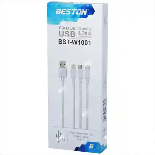 Cable 3 en 1 BST-W1001 Beston -Cable de carga USB y transmisión de datos. -Carga rápida y sincronización de alta velocidad para iPhone, V8 y tipo C. -1 metro.