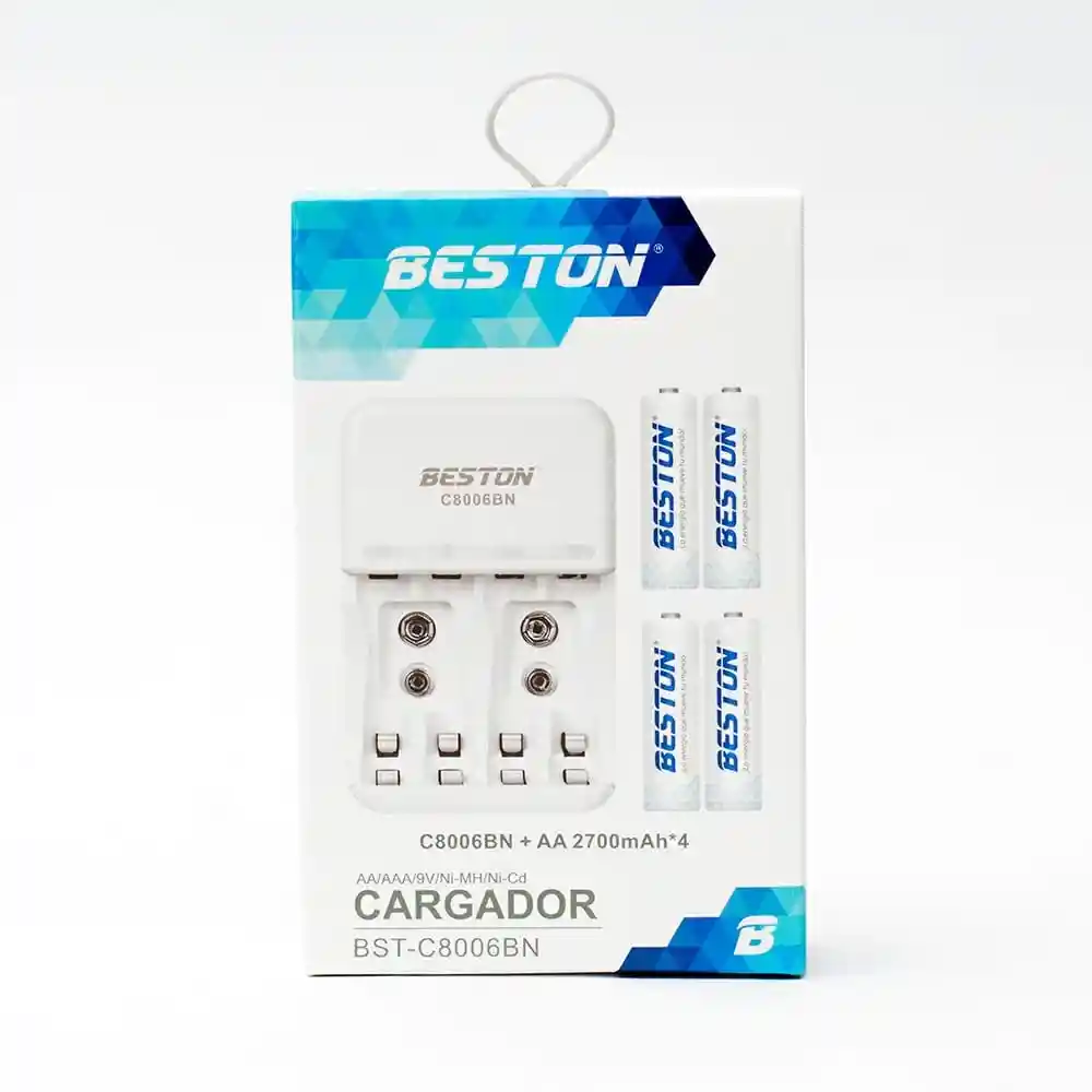 CARGADOR BST-C8001BN AAA X 4 2700mAh (BST-C8006BN) Cargador con Baterías Recargables Beston AAA (4 unidades) de alta tecnología de protección ambiental, sus baterías mejoradas Ni-MH, son del más alto nivel mundial en capacidad nominal. ¿PARA QUE SIRVE EL PRODUCTO? se prende cuando la temperatura está por encima de 60°C. Si el cargador o las baterías están recalentadas durante la carga, se detendrá la carga automáticamente por seguridad. con el modo de corriente constante, cualquier influencia negativa de baterías causada por fluctuaciones de corriente se puede evitar. reconoce las baterías no recargables, los cortocircuitos y las baterías defectuosas, mediante su microprocesador además tiene protección del cortocircuito. Restaura la batería si el voltaje de la batería es extremadamente bajo (ej: 0-0.9V). Con salida USB no pueden cargarse baterías AA / AAA. MODO DE USO: •Descargue por completo las baterías una vez abra el producto. •La primera carga es de 12 horas. •De la segunda carga en adelante son 8 horas. •Único tiempo estimado de carga. PRECAUCIÓN: •El cargador no cargará baterías si están colocadas en la polaridad incorrecta. •No arroje ni coloque objetos pesados sobre el cargador. •Los niños deben usarlo bajo supervisión de un adulto. •Use en temperaturas entre 0°C – 40°C •No lo exponga a altas temperaturas, ni lo arroje al fuego ni al agua. CARACTERISTICAS: •Entrada: AC 100-240v 50/60Hz 10W(Max.) •Salida: DC 1.2V 200mA (AA)/ DC 1.2V 100mA (AAA)/ DC 9V 35mA •Para baterías recargables 1-4 pcs AA/AAA o 1-2 pcs 9V Ni-MH a Ni-CD. •Luz LED encendida para carga, no se apagará cuando las baterías estén completamente cargadas •Referencia: BST-C8001BN CONTENIDO: •Cargador Beston C8001BN + 4 baterías recargables AAA 2700mAh