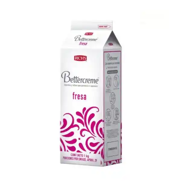 Inspírate con Bettercreme® Fresa y disfruta de su delicioso sabor. Divertida, rica y llena de posibilidades, Bettercreme es la línea de cremas de sabores que te permite hacer piezas maestras destacando ese gusto por los detalles que tanto te caracteriza. -Estable a temperatura ambiente (25° C) manteniendo su apariencia y sabor. -Resistente a altas temperaturas en tu área de trabajo. - Se puede congelar después de batida. -Por su suave y uniforme textura es muy fácil de usar y te permite decorar aún sin ser experto. -¡Es la crema de la celebración! Por su resistencia y estabilidad te permite realizar las formas y figuras de bulto como flores, rosetones, moños, animales y demás figuras que quieras agregar a tu decoración. -Es de origen vegetal, naturalmente libre de colesterol y de grasa trans (Ver Información Nutricional para Grasa Saturada). - Uso previsto: Materia prima para uso industrial y/o como ingrediente en formulaciones o preparaciones alimenticias en diferentes sectores gastronómicos (pastelería, reposterías, bebidas, cocina u otros). Usar de acuerdo con las instrucciones de preparación. -Uso no previsto: No consumir de forma directa (se debe seguir instrucciones de preparación).