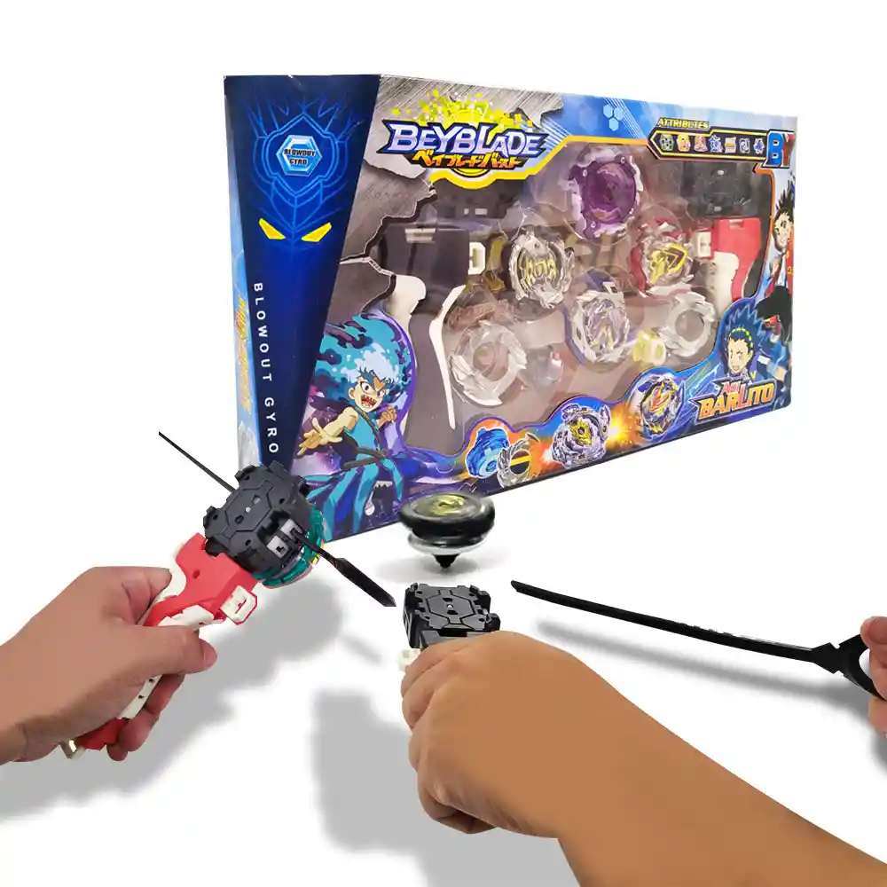BEYBLADE LANZADORES X2 Los Trompos luchan entre sí y el último en resistir gana! Para hacer girar tu Tornado necesitas un lanzador y un estadio no incluido, ¡solo tira y tira para ver tu Tornado en la batalla!. Contenido: 2 Lanzadores completos, 2 tornados completos, 2 carcasas de trompos para cambiar y adhesivos para adornar tus tornados. Medidas Empaque: 20.5 cm de Alto x 37 cm de Largo x 5 cm de Fondo. Materiales: Metal y Plástico Los juguetes siempre han desempeñado un papel importante en la vida de los niños, siempre considerando los gustos y deseos de los más pequeños de la casa y no tan pequeños, procurando dar la mejor de las sorpresas y ganarse esa sonrisa incomparable que los llena de felicidad. Juguetes, cuentos, y cualquier producto orientado a la satisfacción y desarrollo de los niños. Diversión, entretenimiento y aprendizaje