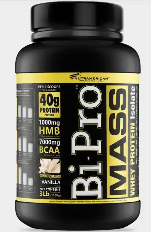 Bi-Pro Mass contiene proteína de suero de leche bovina (Alfa lactoalbúmina, Beta lactoglobulina, Lactoferrina, Albumina del suero), como la única fuente de proteína (no contiene soya ni caseínatos), ideal para ser consumida después de entrenar por su bajo peso molecular. Contiene 1.000 mg HMB, 7.000 mg de Bcaa (Aminoácidos de cadena ramificada) añadidos, aporta 30 gramos de proteína por servicio. Registro Invima RSA-0030639-2024. Proteína de suero de leche. 1g HMB (Hidroximetilbutirato). 7g Bcaas (Aminoácidos de cadena ramificada). 30g de proteína por porción. 270 calorías.