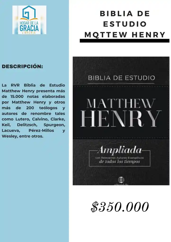 La RVR Biblia de estudio Matthew Henry presenta más de 15.000 notas elaboradas por Matthew Henry y otros más de 200 teólogos y autores de renombre.