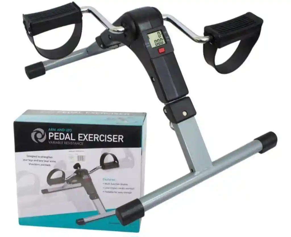 *Bicicleta Estática Ejercitador Pedal Portátil* Funcionalidad: Cuenta con una pantalla LCD multifunción que rastrea el tiempo, la distancia y las calorías quemadas. Resistencia: Dispone de una perilla de tensión ajustable para controlar la intensidad del ejercicio. Diseño: Es plegable, lo que facilita su transporte y almacenamiento debajo de escritorios o en espacios reducidos. Seguridad: Incluye correas en los pedales y patas antideslizantes para mayor estabilidad durante el uso. Uso: Ideal para rehabilitación, personas mayores o personas con poco tiempo para ejercitarse en casa u oficina.