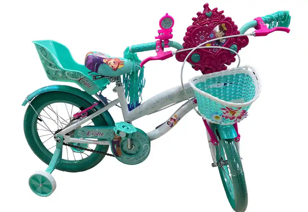 Hermosa Bicicleta de niña, Especificaciones: - Marco y tenedor en acero, - tablero de princesas musical, - Canasta - Porta muñeca. - Tamaño: 16" La bicicleta viene parcialmente armada en caja, debes ponerle las ruedas auxiliares La garantía en el marco es por 1 año contra defectos de fabricación en soldadura Producto hecho en china.