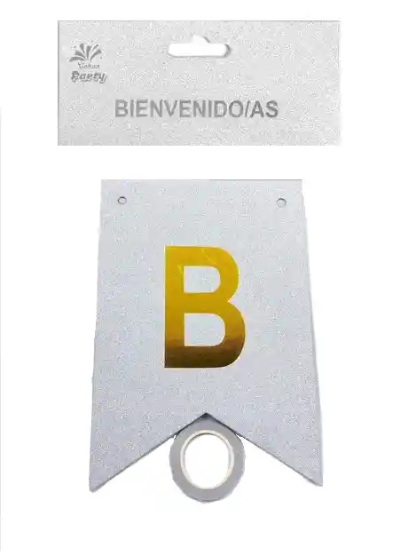Paquete de 12 banderines con las letras BIENVENIDOAS. Incluye la letra A para usar en femenino y en masculino. En singular: Bienvenido, Bienvenida En plural: Bienvenidos, Bienvenidas El letrero es color plateado escarchado y las letras son en color dorado metalizado Cada banderìn mide 16.5 cm x 11.5 cm aproximadamente