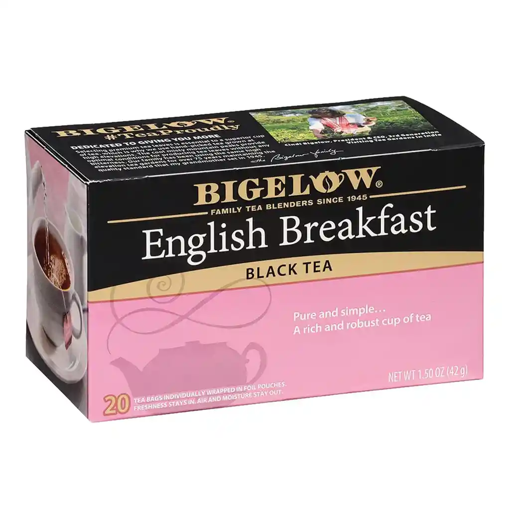 Comienza tu día con fuerza y elegancia con el Bigelow English Breakfast Black Tea, una mezcla robusta y aromática elaborada con hojas de té negro 100% premium. Su alto contenido natural de cafeína brinda un impulso energético ideal para despertar cuerpo y mente, mejorando la concentración sin los efectos artificiales de bebidas energéticas. Cada bolsita ofrece un sabor profundo y tradicional que revitaliza, te acompaña en tus rutinas matutinas y se convierte en tu mejor aliado para mantener el enfoque y el bienestar durante el día.