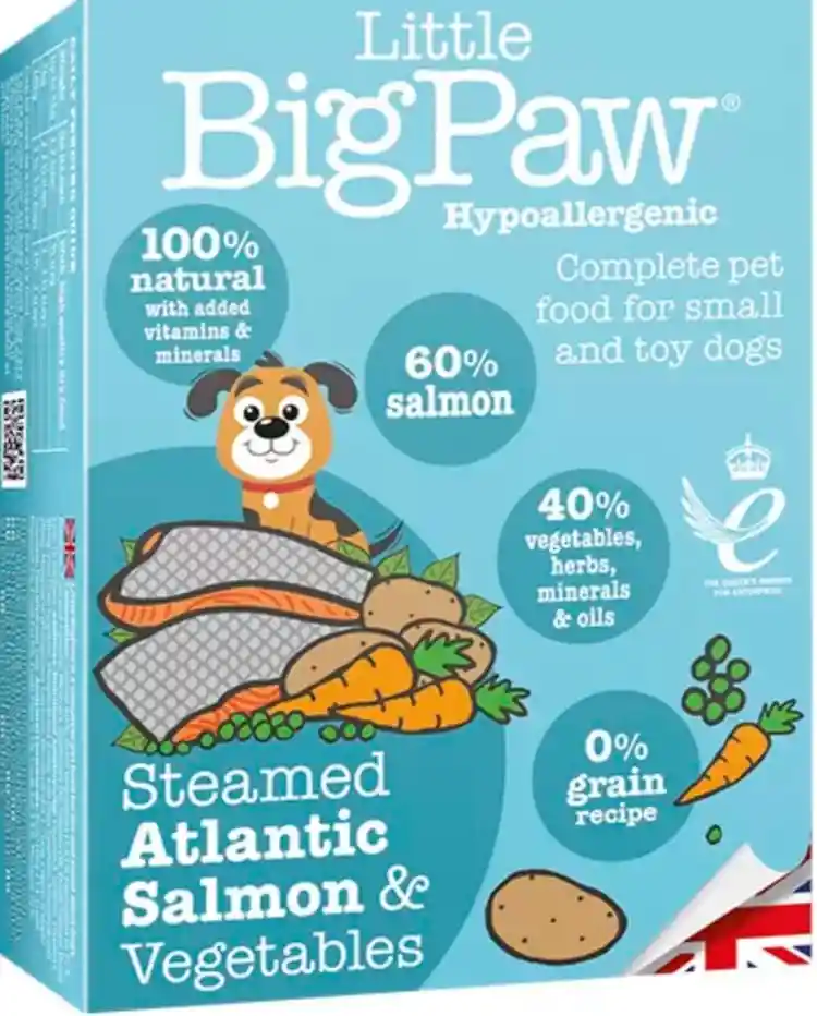 Las razas de perros pequeños y diminutos también necesitan una buena dieta nutritiva y rica en proteínas para mantener altos esos niveles de energía. Mantenga a su perro sano y activo con la receta original de carne y verduras de Little Big Paw. Esta comida húmeda rica en proteínas y sin cereales está elaborada con un 60 % de carne de salmón. El chef también lo cocinó al vapor con hierbas aromáticas para hacerle cosquillas a las papilas gustativas de su perro. Esta comida sabrosa y nutritiva estaría de acuerdo incluso con los comedores quisquillosos y alergénicos. Beneficios clave Comida 100% Natural, balanceada y húmeda Contiene un 60 % de delicioso salmón del Atlántico, rico en aceite omega y proteínas Las papas, los guisantes verdes y las zanahorias proporcionan carbohidratos esenciales para una energía óptima Complementado con complejo de vitaminas A, D, E y B para aumentar la inmunidad. Los ácidos grasos esenciales y el aceite omega nutren el lavabo y el abrigo. Las hierbas nutritivas de albahaca y algas marinas respaldan la salud y el bienestar general NO: conservantes artificiales, colorantes, saborizantes, cereales, trigo, soja y productos lácteos 100% británico